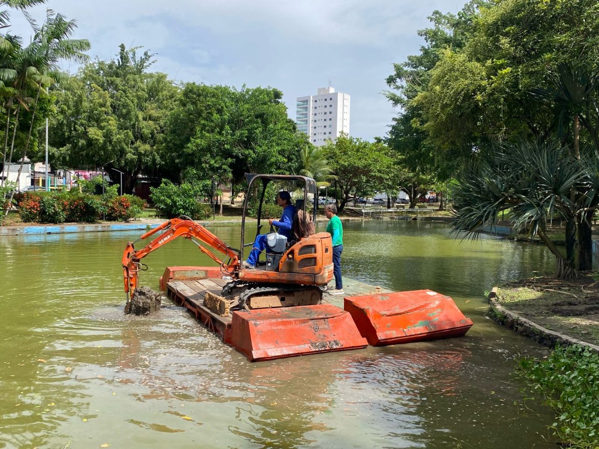 A Secretaria de Zeladoria Urbana (Semzur) deu início na semana passada ao processo de desassoreamento dos lagos da Praça Floriano Peixoto, um dos principais cartões-postais da capital. A ação remove acúmulos de lixo, sedimentos e lodo do fundo dos espelhos d’água, garantindo o fluxo adequado e prevenindo alagamentos nos períodos de chuva.