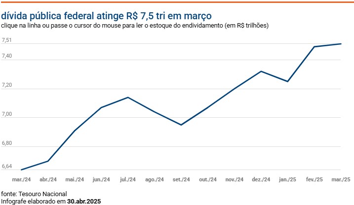 O estoque da dívida pública federal atingiu R$ 7,51 trilhões em março de 2025. Foi uma elevação de 0,22% ante o saldo do mês anterior, que era de R$ 7,49 trilhões. Em termos nominais, o aumento foi de R$ 16 bilhões.