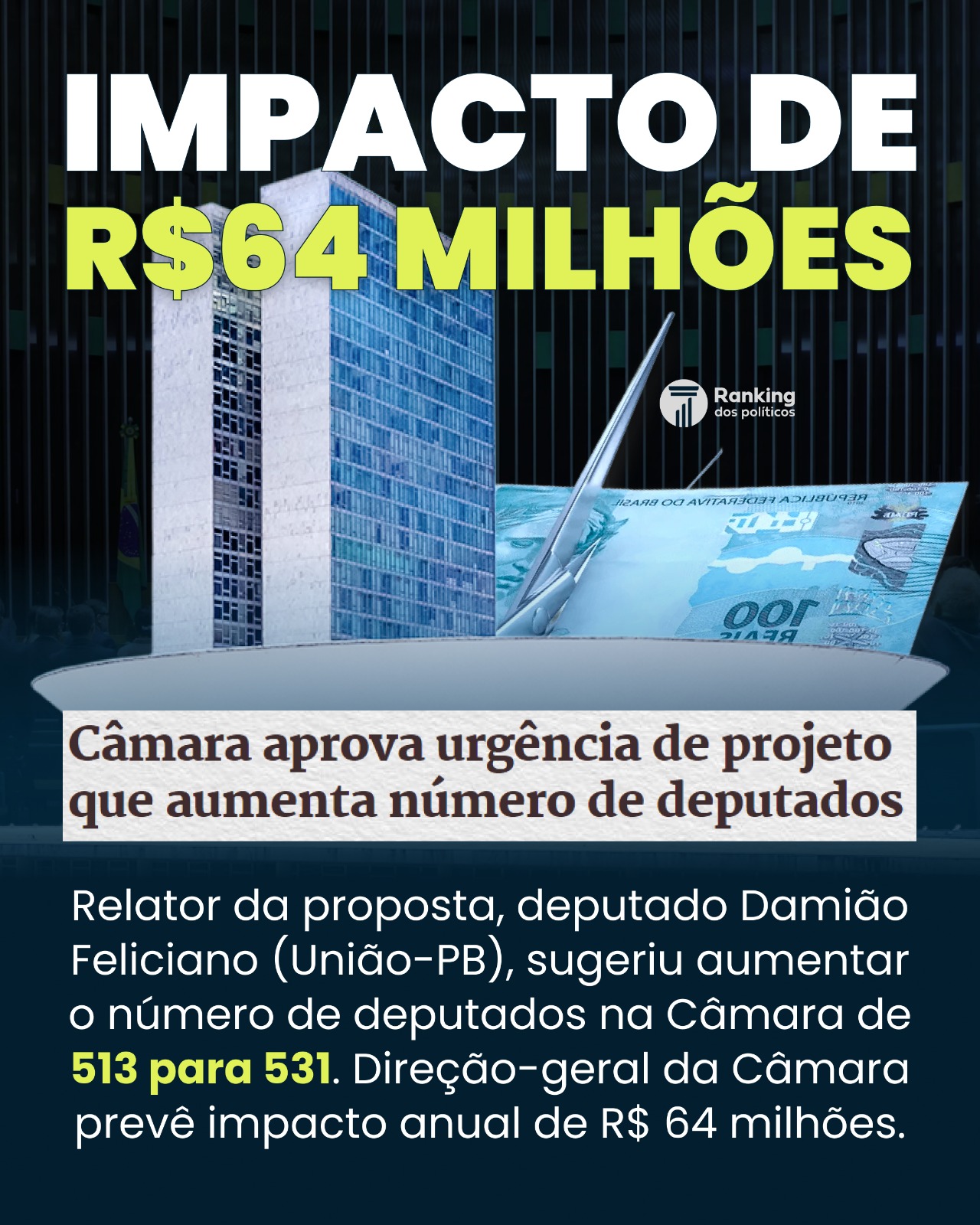 A Câmara dos Deputados aprovou nesta terça-feira (6), por 268 votos a favor e 199 contra, a tramitação em urgência do projeto de lei complementar (PLP) 177 de 2023, que prevê o aumento de 513 para 531 o número de deputados federais no Brasil.