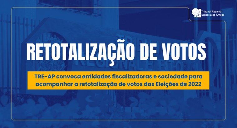 O Tribunal Regional Eleitoral do Amapá (TRE-AP) está convocando entidades fiscalizadoras e a sociedade civil para acompanhar o processo de retotalização dos votos das Eleições Gerais de 2022. O evento ocorrerá no dia 09 de junho de 2025, às 9h, no auditório do prédio sede do tribunal.