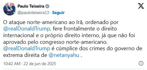 O ministro do Desenvolvimento Agrário e Agricultura Familiar do Brasil, Paulo Teixeira, condenou, neste domingo (22), os ataques dos Estados Unidos a instalações nucleares iranianas. Em publicação no X, Paulo Teixeira afirmou que o ataque fere o direito internacional. O Itamaraty ainda não se manifestou sobre os ataques. “O ataque norte-americano ao Irã, ordenado por Trump, fere frontalmente o direito internacional e o próprio direito interno, já que não foi aprovado pelo congresso norte-americano. Trump é cúmplice dos crimes do governo de extrema-direita de Netanyahu”, disse. Na noite deste sábado (21), o presidente dos EUA, Donald Trump, anunciou que as Forças Armadas americanas concluíram um “ataque muito bem-sucedido” contra as instalações nucleares do Irã, incluindo Fordow, Natanz e Isfahan. A relação bilateral entre Brasil e Irã vive um momento de estabilidade, após um curto período de tensão durante a gestão do ex-presidente Jair Bolsonaro, que chegou a criticar publicamente o regime iraniano. Em 2025, autoridades do Brasil e do Irã se reuniram diversas vezes em Brasília, durante os eventos preparatórios para a Cúpula dos Chefes de Estado do Brics, que acontece em julho, no Rio de Janeiro. Foram reuniões ministeriais com representantes dos países do bloco econômico, tratando de temas específicos como agropecuária, infraestrutura e saúde. A expectativa é que autoridades iranianas e brasileiras voltem a se encontrar durante a cúpula. O Irã passou a integrar o Brics em 2024, quando o grupo foi ampliado. Na ocasião, o presidente iraniano, Masoud Pezeshkian, afirmou que os Brics são “uma saída para o totalitarismo dos EUA”. Os Estados Unidos são o segundo maior parceiro comercial do Brasil, com o fluxo de comércio que ultrapassou a casa dos US$ 80 bilhões em 2024. CNN Brasil Visualizações 66 Anúncios