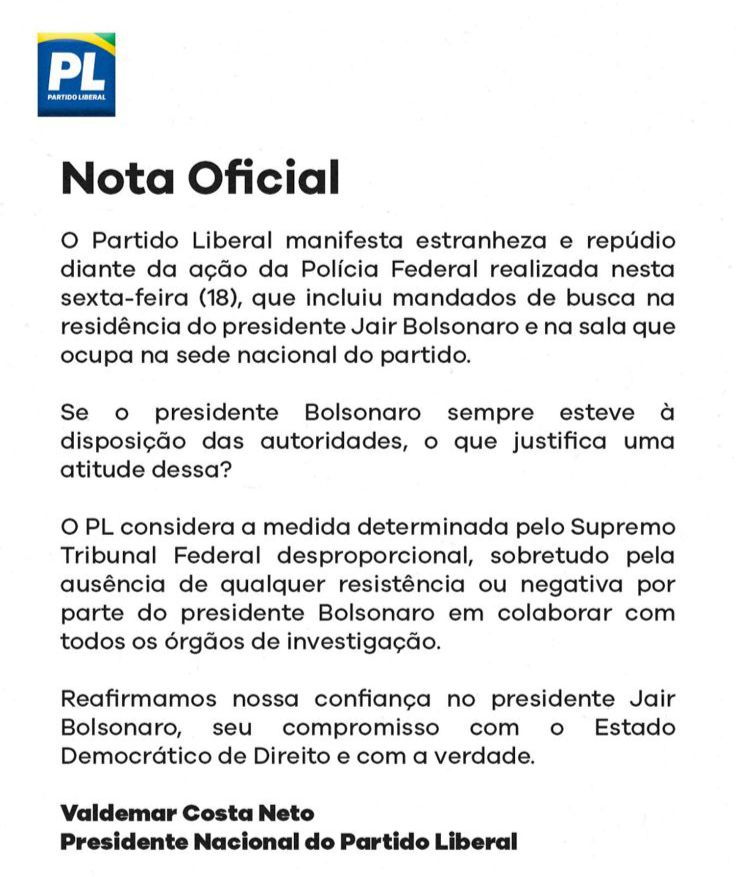 Foto: Reprodução O presidente do PL, Valdemar Costa Neto, afirmou, em nota nesta sexta-feira (18), que a decisão do ministro Alexandre de Moraes, do STF (Supremo Tribunal Federal), contra o ex-presidente Jair Bolsonaro (PL) é “desproporcional”. “O PL considera a medida determinada pelo Supremo Tribunal Federal desproporcional, sobretudo pela ausência de qualquer resistência ou negativa por parte do presidente Bolsonaro em colaborar com todos os órgãos de investigação”, diz trecho do comunicado (leia a íntegra mais abaixo). Moraes autorizou a PF (Polícia Federal) a cumprir mandados de busca e apreensão na sede do PL e em endereços de Bolsonaro. Além disso, o magistrado determinou uma série de medidas cautelares contra o ex-mandatário, incluindo uso de tornozeleira eletrônica. Segundo apurou a CNN, a decisão do STF foi tomada por um elevado risco de fuga para os Estados Unidos. A nota assinada por Valdemar ainda diz que o partido manifesta “estranheza e repúdio” diante da operação. “Se o presidente Bolsonaro sempre esteve à disposição das autoridades, o que justifica uma atitude dessa?”. “Reafirmamos nossa confiança no presidente Jair Bolsonaro, seu compromisso com o Estado Democrático de Direito e com a verdade”, finaliza. Veja íntegra O Partido Liberal manifesta estranheza e repúdio diante da ação da Polícia Federal realizada nesta sexta-feira (18), que incluiu mandados de busca na residência do presidente Jair Bolsonaro e na sala que ocupa na sede nacional do partido. Se o presidente Bolsonaro sempre esteve à disposição das autoridades, o que justifica uma atitude dessa? O PL considera a medida determinada pelo Supremo Tribunal Federal desproporcional, sobretudo pela ausência de qualquer resistência ou negativa por parte do presidente Bolsonaro em colaborar com todos os órgãos de investigação. Reafirmamos nossa confiança no presidente Jair Bolsonaro, seu compromisso com o Estado Democrático de Direito e com a verdade. Valdemar Costa Neto Presidente Nacional do Partido Liberal CNN Visualizações 24 Anúncios