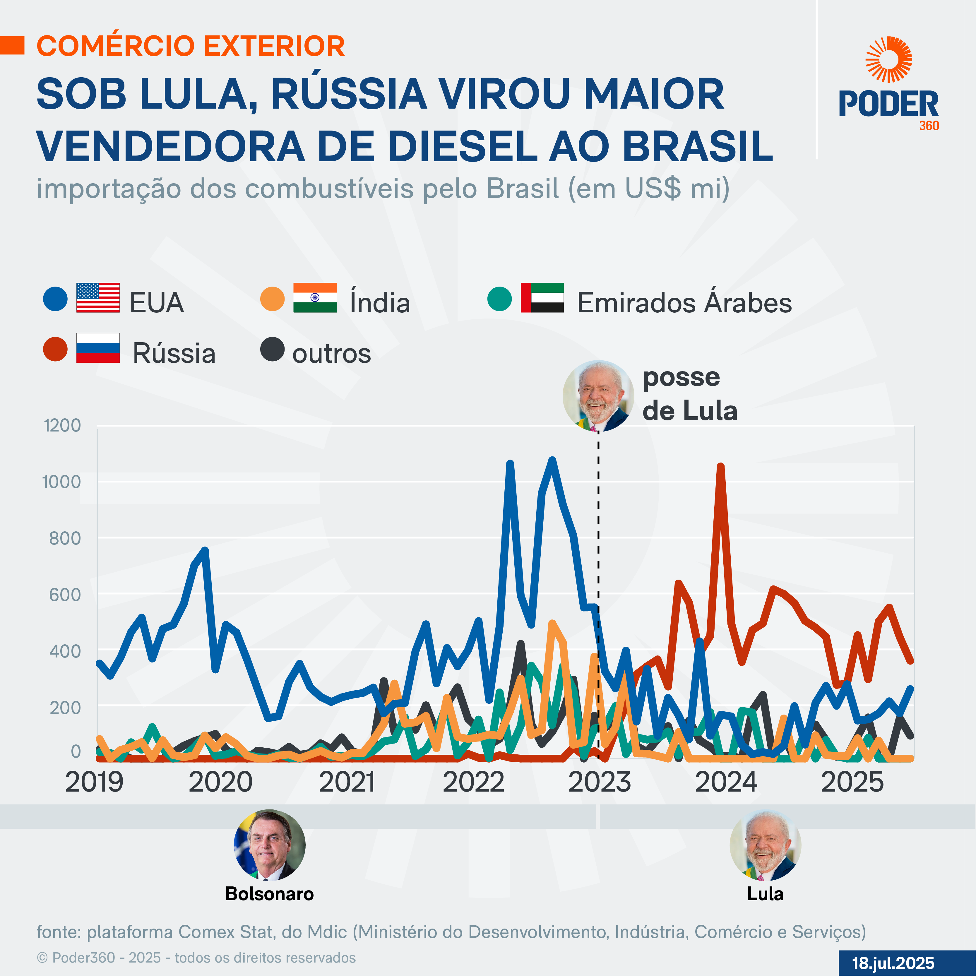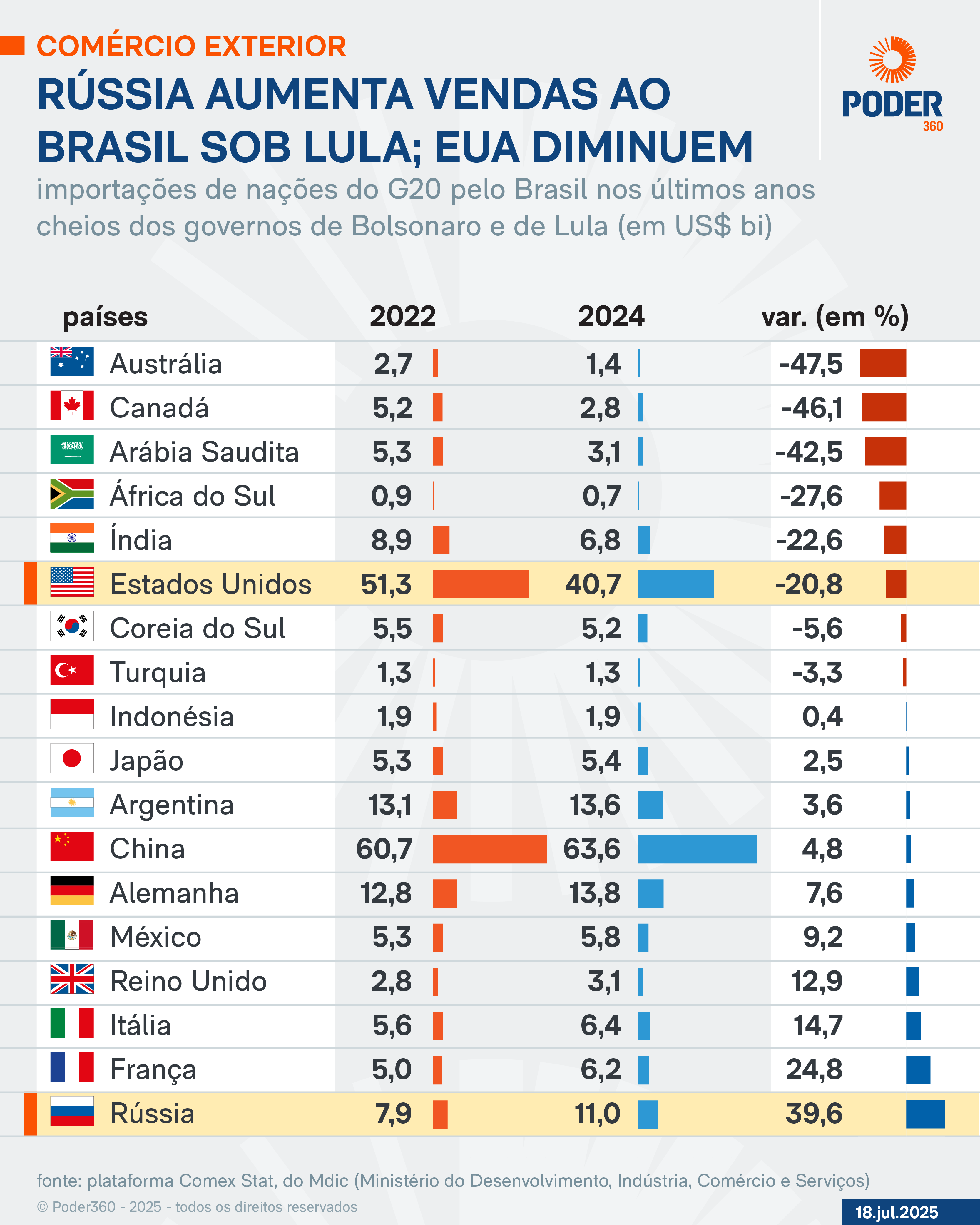 Na contramão, os brasileiros passaram a comprar mais de países como Rússia (+39,6%) e China (+4,8%). O movimento tende a ser utilizado como munição para o tarifaço iniciado pelo presidente dos EUA, Donald Trump (Partido Republicano).