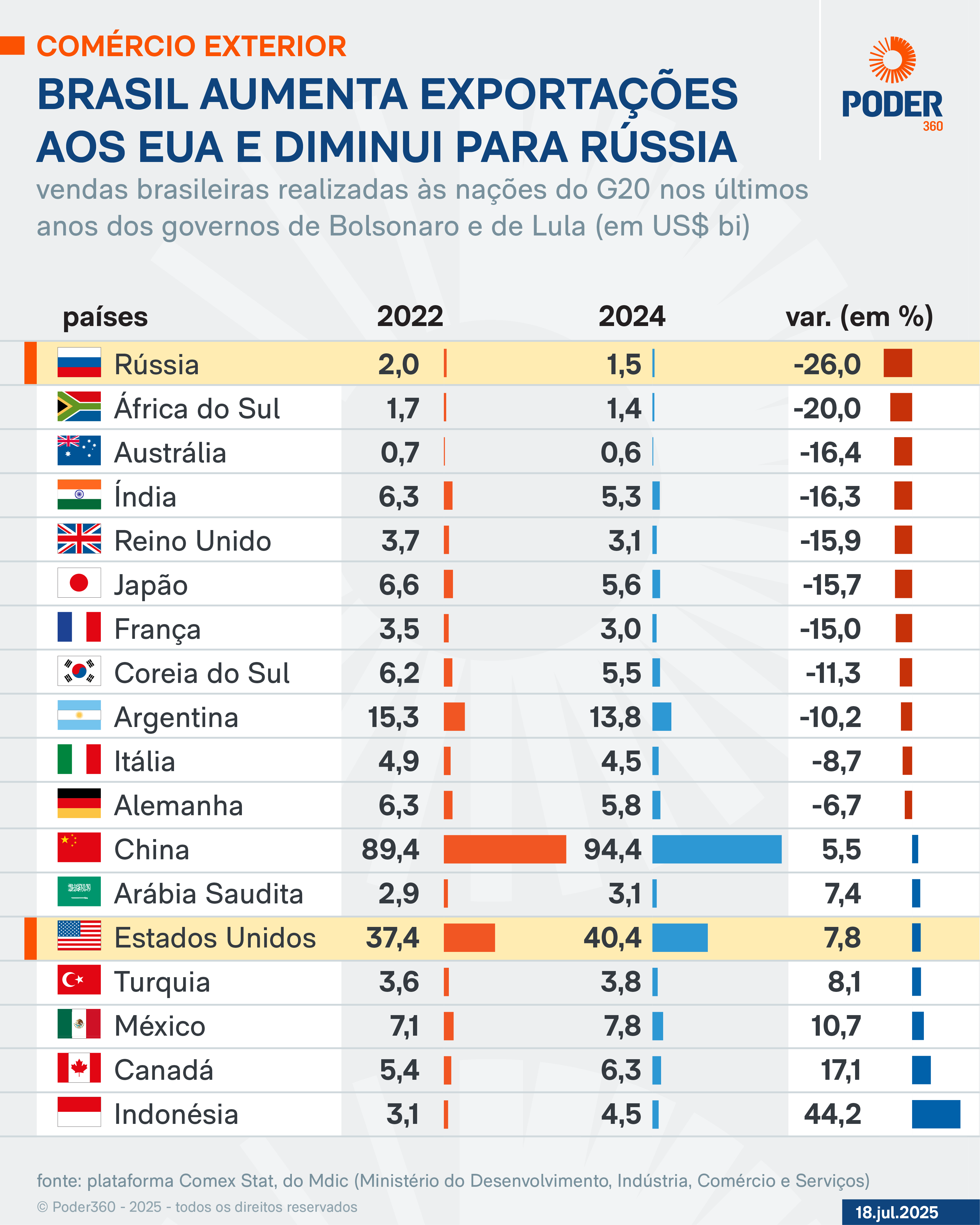 O Poder360 levantou os dados do Mdic (Ministério do Desenvolvimento, Indústria, Comércio e Serviços) de 2022 e 2024 para os países do G20 (grupo das maiores economias).