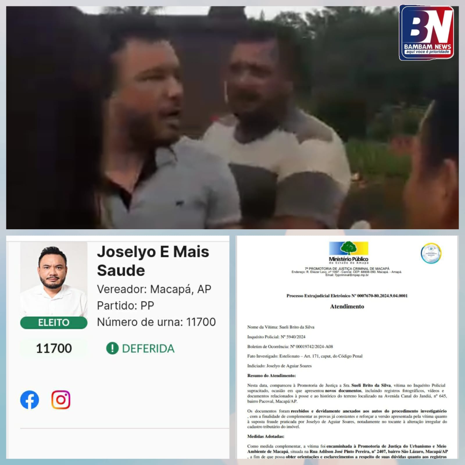 O vereador de Macapá, Joselyo de Aguiar Soares (PP), conhecido nas urnas como Joselyo É Mais Saúde, está sendo investigado pelo Ministério Público do Estado do Amapá (MP-AP) por suposto crime de estelionato (Art. 171 do Código Penal). O procedimento decorre de denúncia feita por Sueli Brito da Silva, que afirma ter sido vítima de fraude relacionada a um terreno localizado na Avenida Canal do Jandiá, nº 645, no bairro Pacoval, em Macapá.