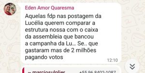 As mensagens são explícitas. A suplente Lucélia Quaresma inicia os ataques contra o jornalista Jean Bambam, do portal Bambam News, “Esse Bambam é um filho da P. Já começaram a mexer na minha vida”. Em outro trecho, ela dispara: “Eu dormi prefeito e acordei bandido, puta merda” – uma referência direta à Operação da Polícia Federal que investiga o Hospital Municipal.