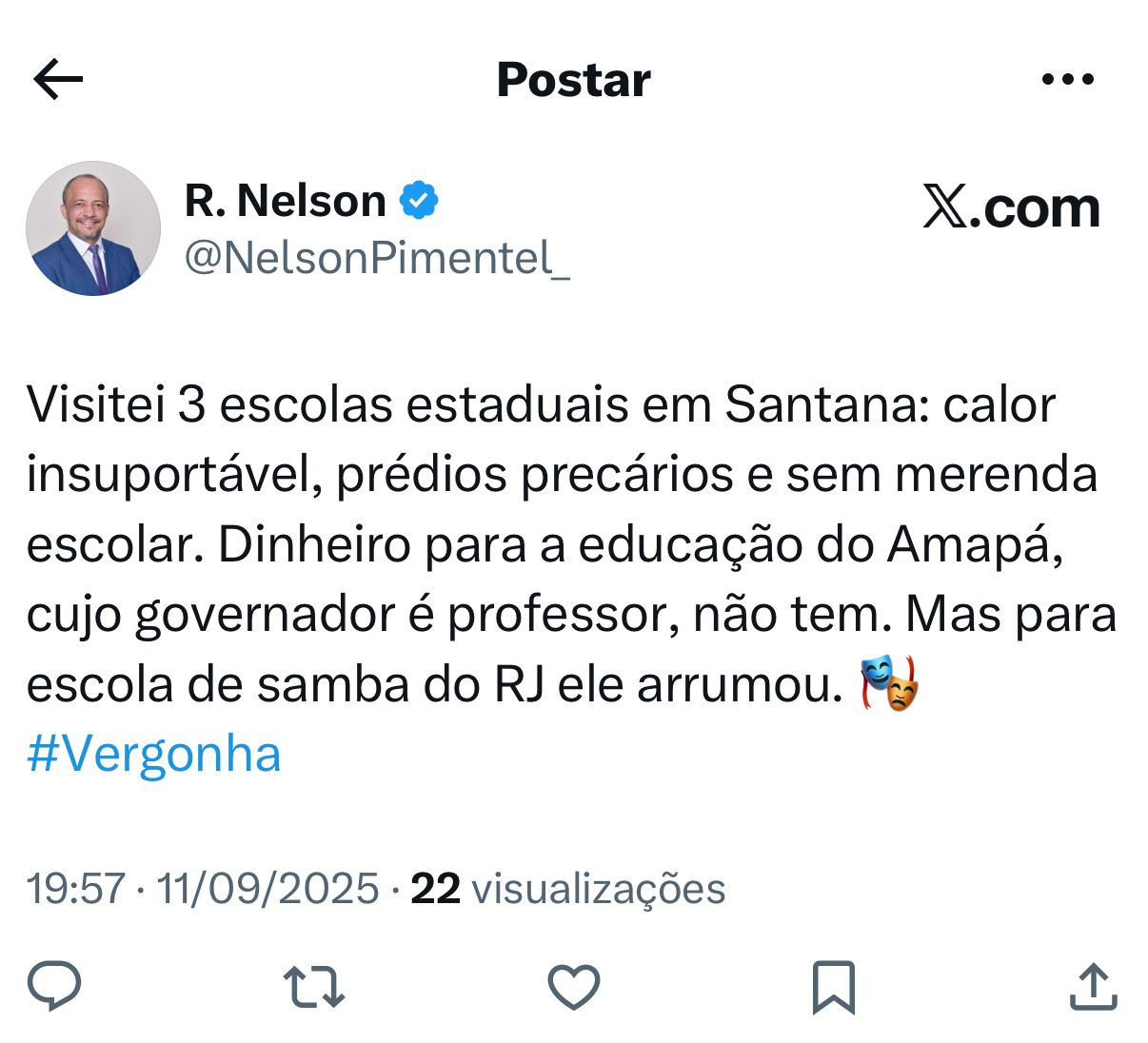 Indignado, o deputado R. Nelson detonou a gestão estadual. “Dinheiro para a educação do Amapá não tem. Mas para escola de samba do Rio de Janeiro ele arrumou R$ 10 milhões. Para a ExpoFeira, foram R$ 44 milhões. É uma vergonha”, criticou o parlamentar, em referência direta aos investimentos do governador em eventos fora do estado. “O governador é professor, mas está virando as costas para a educação do Amapá”, completou.