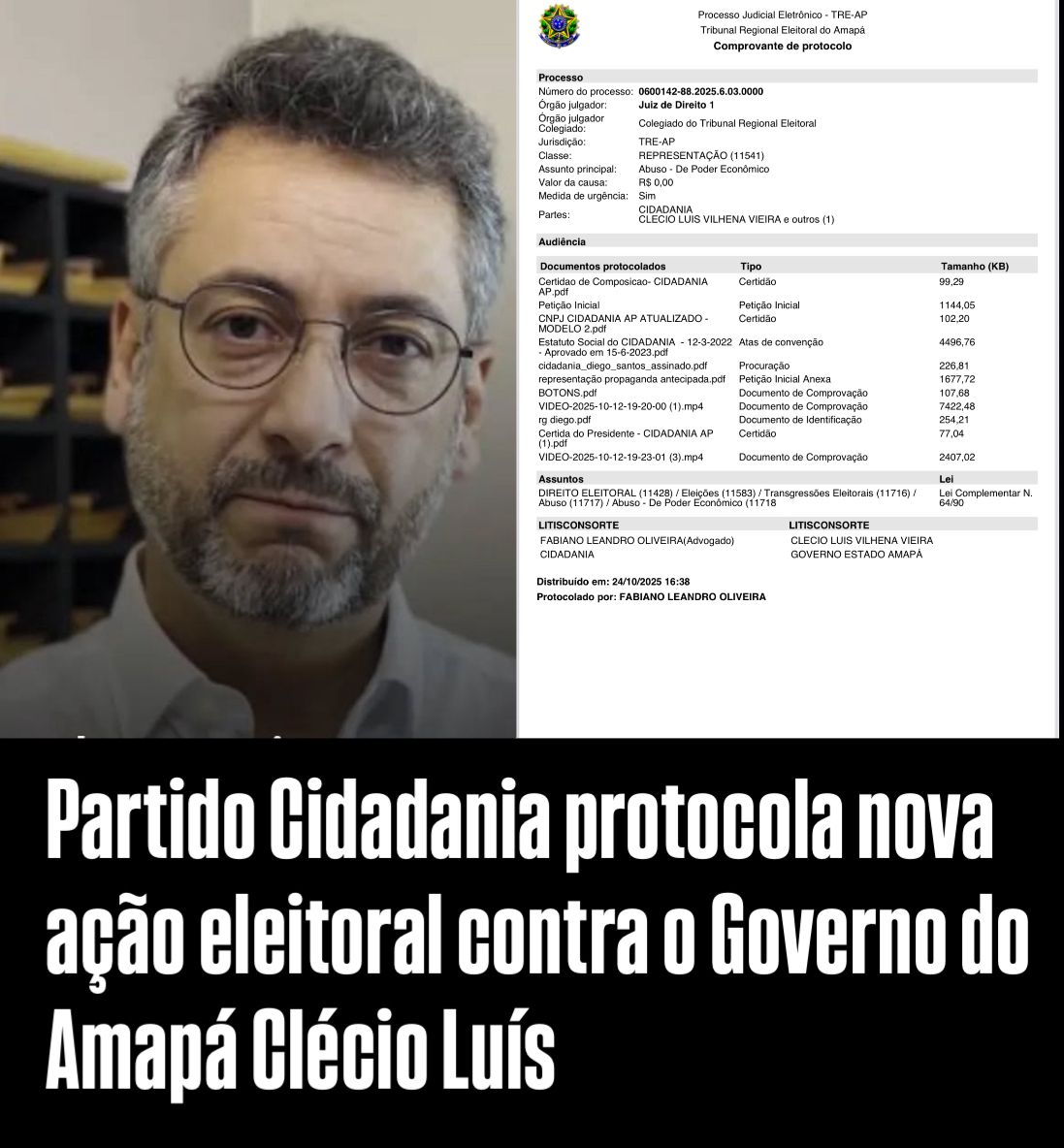 Macapá (AP), 24 de outubro de 2025 — O Partido Cidadania do Amapá, sob a presidência de Diego Santos, reforçou nesta sexta-feira (24) sua postura firme e vigilante diante de possíveis irregularidades cometidas pela atual gestão estadual. Após decisão proferida pelo Tribunal Regional Eleitoral do Amapá (TRE/AP) no processo AIJE nº 0600137-66.2025.6.03.0000, o partido protocolou nova Representação Eleitoral (nº 0600142-88.2025.6.03.0000) para apurar o uso de recursos públicos e ações de comunicação institucional com suposto viés de autopromoção política. A medida tem como foco o programa “Eu Visto a Camisa do Amapá”, amplamente divulgado em canais oficiais do Governo do Estado e nas redes sociais pessoais do governador Clécio Luís.