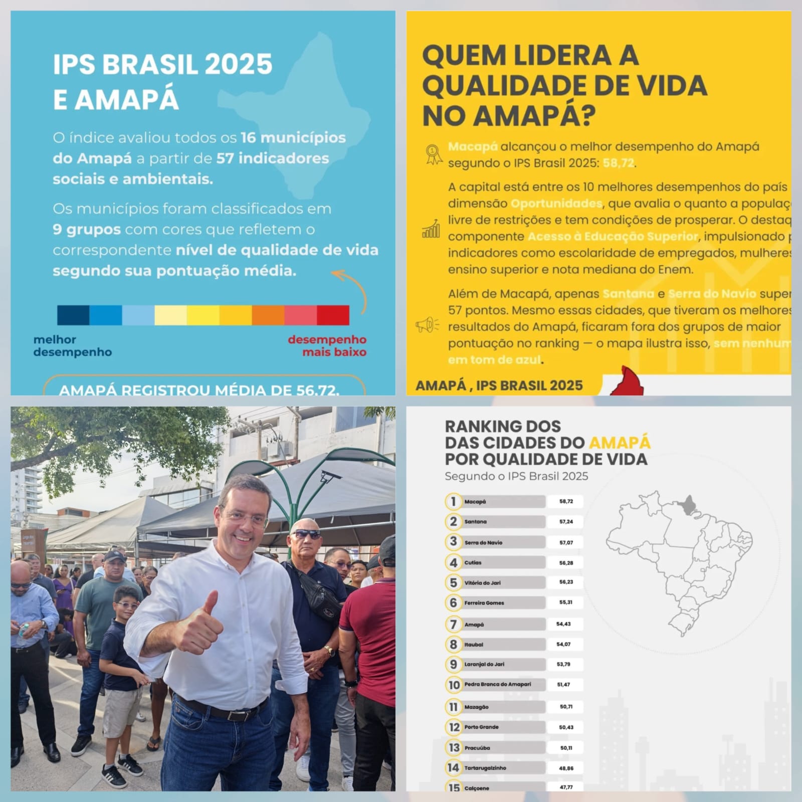 Com 58,72 pontos, Macapá lidera o ranking estadual. O destaque da capital ficou na dimensão “Oportunidades”, com bons resultados principalmente no item “Acesso à Educação”. A administração municipal, sob o comando do prefeito Dr. Furlan, atribui a posição à eficiência de suas políticas públicas, que, segundo ela, têm avançado na qualidade de vida da população.