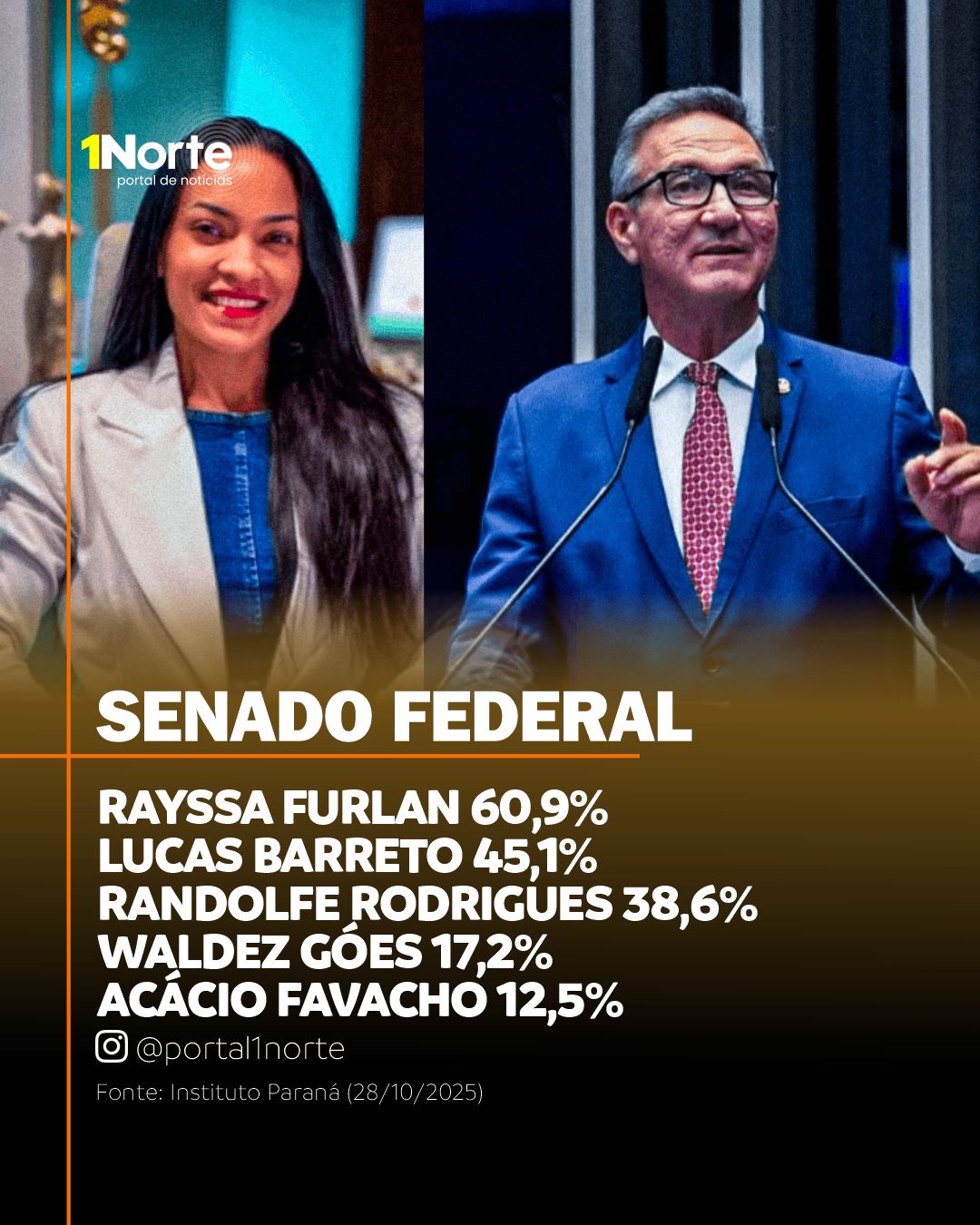 De acordo com o levantamento, Rayssa Furlan registra 60,9% dos votos válidos, consolidando uma vantagem expressiva e estabilidade em relação à pesquisa anterior, realizada em julho. Em segundo lugar aparece o senador Lucas Barreto (PSD), com 45,1%, mantendo-se na corrida por uma das cadeiras amapaenses em Brasília.