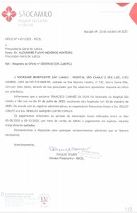 O ofício nº 1431/2025, emitido pelo Hospital São Camilo, confirma que o fazendeiro esteve internado entre 31 de julho e 10 de outubro de 2025, e que os pagamentos foram realizados entre 5 de agosto e 9 de outubro, por meio de cartão de débito e valores em espécie, estando “integralmente quitados”.