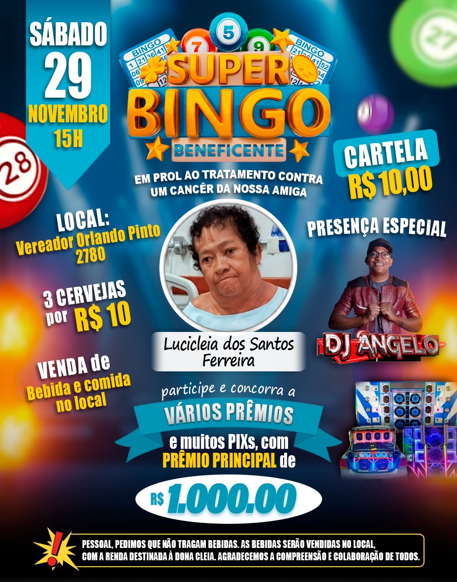 No sábado, dia 29 de novembro, a partir das 15h, será realizado o Super Bingo Beneficente em apoio ao tratamento contra o câncer da senhora Lucicleia dos Santos Ferreira. O evento acontecerá na Avenida Vereador Orlando Pinto, nº 2780, e promete reunir solidariedade, música e muita diversão.