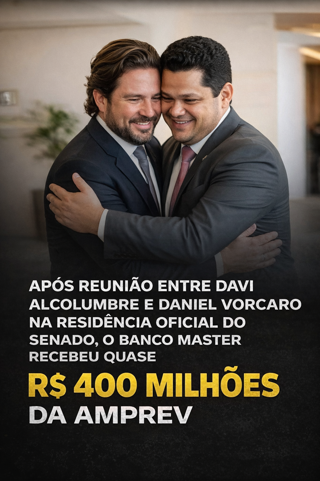 A polêmica ganhou força após vir à tona que Daniel Vorcaro, controlador do Banco Master, esteve reunido com Davi Alcolumbre na residência oficial do Senado, em Brasília. O encontro aconteceu justamente no período que antecedeu a aplicação milionária da previdência estadual no banco.