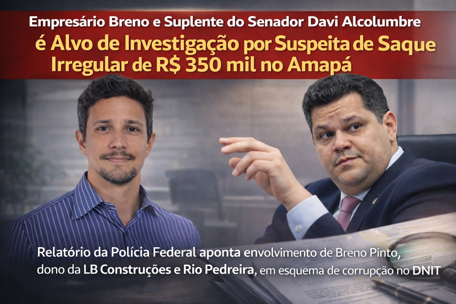 Uma cena digna de filme policial acabou registrada pela Polícia Federal no Amapá: o empresário Breno Chaves Pinto, segundo suplente do senador Davi Alcolumbre, foi flagrado saindo de uma agência bancária com R$ 350 mil em dinheiro vivo dentro de uma mochila. O detalhe é que o episódio aconteceu em pleno andamento de uma investigação sobre suspeitas de fraude em contratos do DNIT.