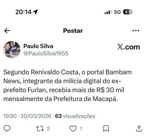 A publicação, atribuída a terceiros e replicada na plataforma X (antigo Twitter), afirma, sem apresentação de provas, que o veículo faria parte de uma suposta “milícia digital” e manteria vínculo financeiro com o poder público municipal.