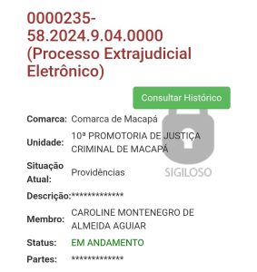 O procedimento segue em andamento, sob status de sigilo, tramitando na 10ª Promotoria de Justiça Criminal de Macapá, o que indica que diligências e análises ainda estão sendo realizadas.